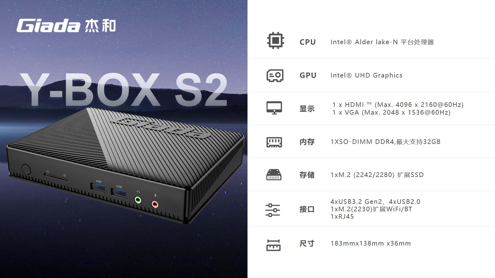 Y-BOX S2處理器平臺(tái)為Alder Lake-N,是英特爾首款采用7納米制程的產(chǎn)品系列。采用主流的DDR4內(nèi)存,支持 M.2和eMMC多存儲(chǔ)設(shè)備可選,M.2支持PCIE X2和SATA SSD,可滿(mǎn)足客戶(hù)對(duì)高數(shù)據(jù)讀寫(xiě)的需求,最大支持32GB;具備一個(gè)HDMI接口和一個(gè)VGA接口,可以連接到顯示器、電視及投影儀,HDMI接口支持最高分辨率為4096 x 2160@60Hz,VGA接口支持最高分辨率為2048 x 1536@60Hz。