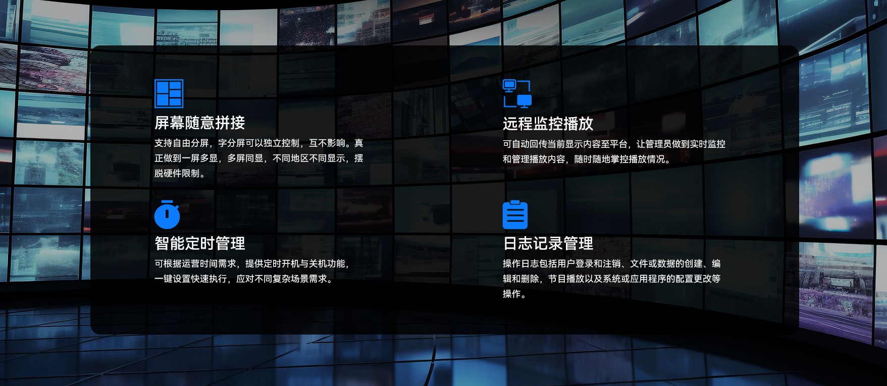 杰和GDSM-ES智能零售管理系統(tǒng)可 實現(xiàn)多屏拼接/多屏分離自由選擇,也可畫中畫顯示,用戶可根據(jù)場景自行靈活安排,更可以異形屏幕顯示安排,讓廣告顯示更加豐富多彩。同時,還可以輕松查看設(shè)備的基本信息,如連接狀態(tài)、播放狀態(tài)、播放到期時間,屏幕類型等;可對設(shè)備進行分組遠(yuǎn)程管理,遠(yuǎn)程設(shè)置定時開關(guān)機時間,控制設(shè)備音量,遠(yuǎn)程重啟、遠(yuǎn)程升級,遠(yuǎn)程截屏查看實時畫面等,實現(xiàn)屏幕智能管理。