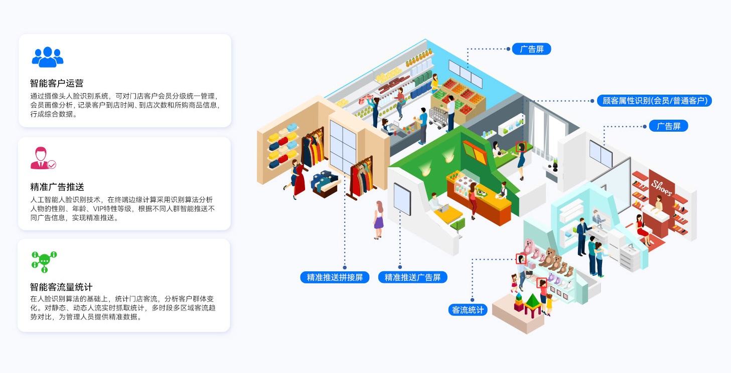 杰和GDSM-ES智能零售管理系統(tǒng)還可實現(xiàn)宣傳推廣內(nèi)容的精準(zhǔn)推送,高效觸達(dá)。系統(tǒng)融合人工智能技術(shù),采用專業(yè)的人臉識別算法,通過終端接入攝像設(shè)備與AIOT設(shè)備,自動識別不同的物體、動作和行為,形成人物畫像,為廣告屏幕的內(nèi)容推送提供數(shù)據(jù)支持,實現(xiàn)精準(zhǔn)營銷。同時還可以提供客流統(tǒng)計和客群分析功能,為零售客戶提供精準(zhǔn)的門店數(shù)字化運營管理方案。