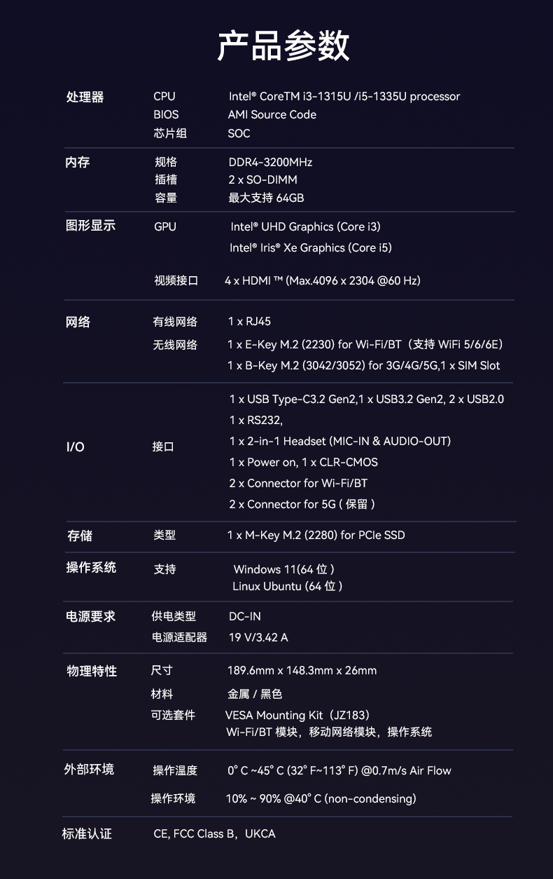 杰和科技D613采用英特爾Raptor Lake酷睿i3-1315U/i5-1335U 處理器,作為一款性能強(qiáng)悍的主機(jī),它的TDP僅15W,能有效降低能耗,延長(zhǎng)電池壽命。在內(nèi)存方面,D613采用2 x SO-DIMM DDR4-3200 MHz,最大可達(dá)64GB,并配備1 x M-Key M.2 (2280) for PCIe SSD。