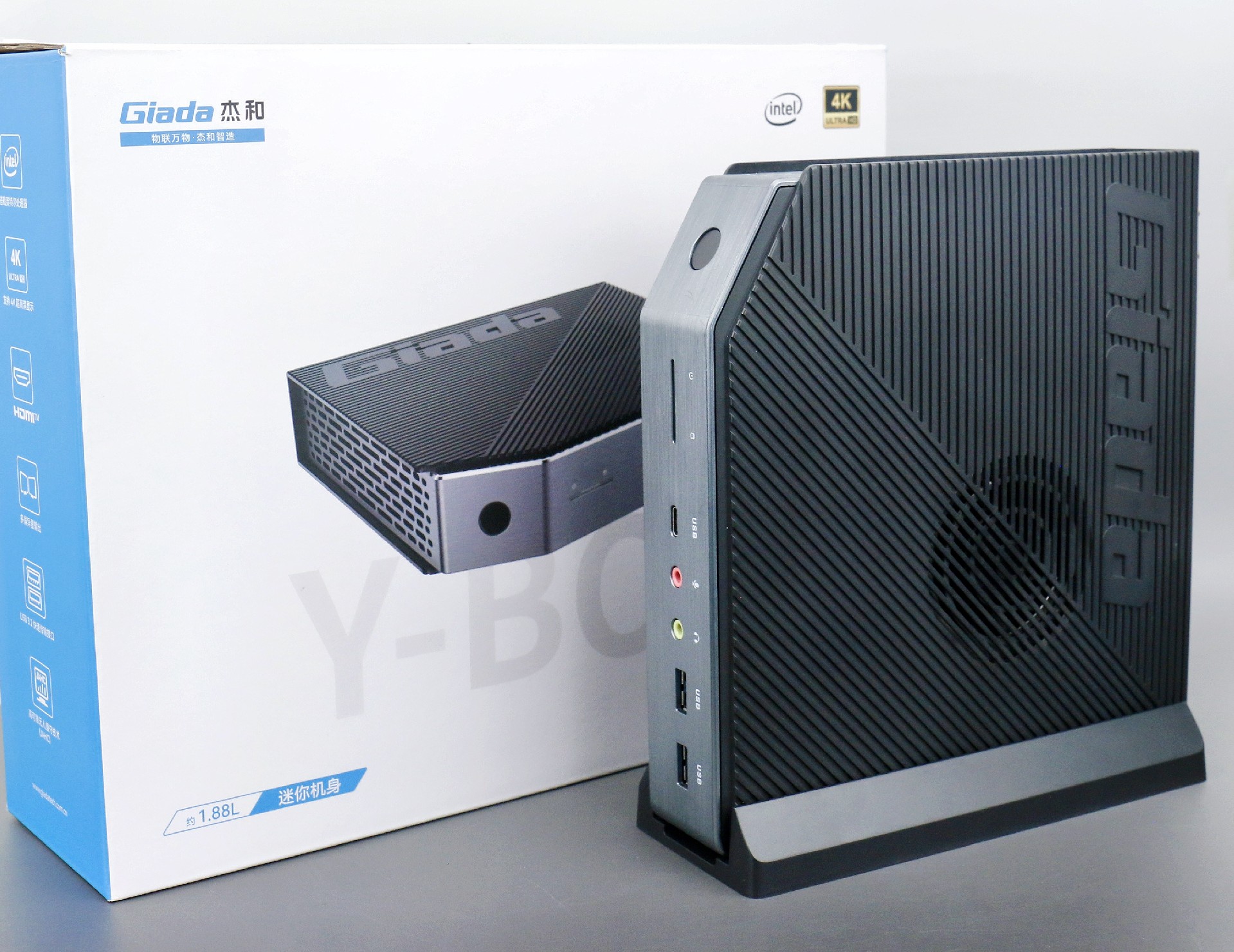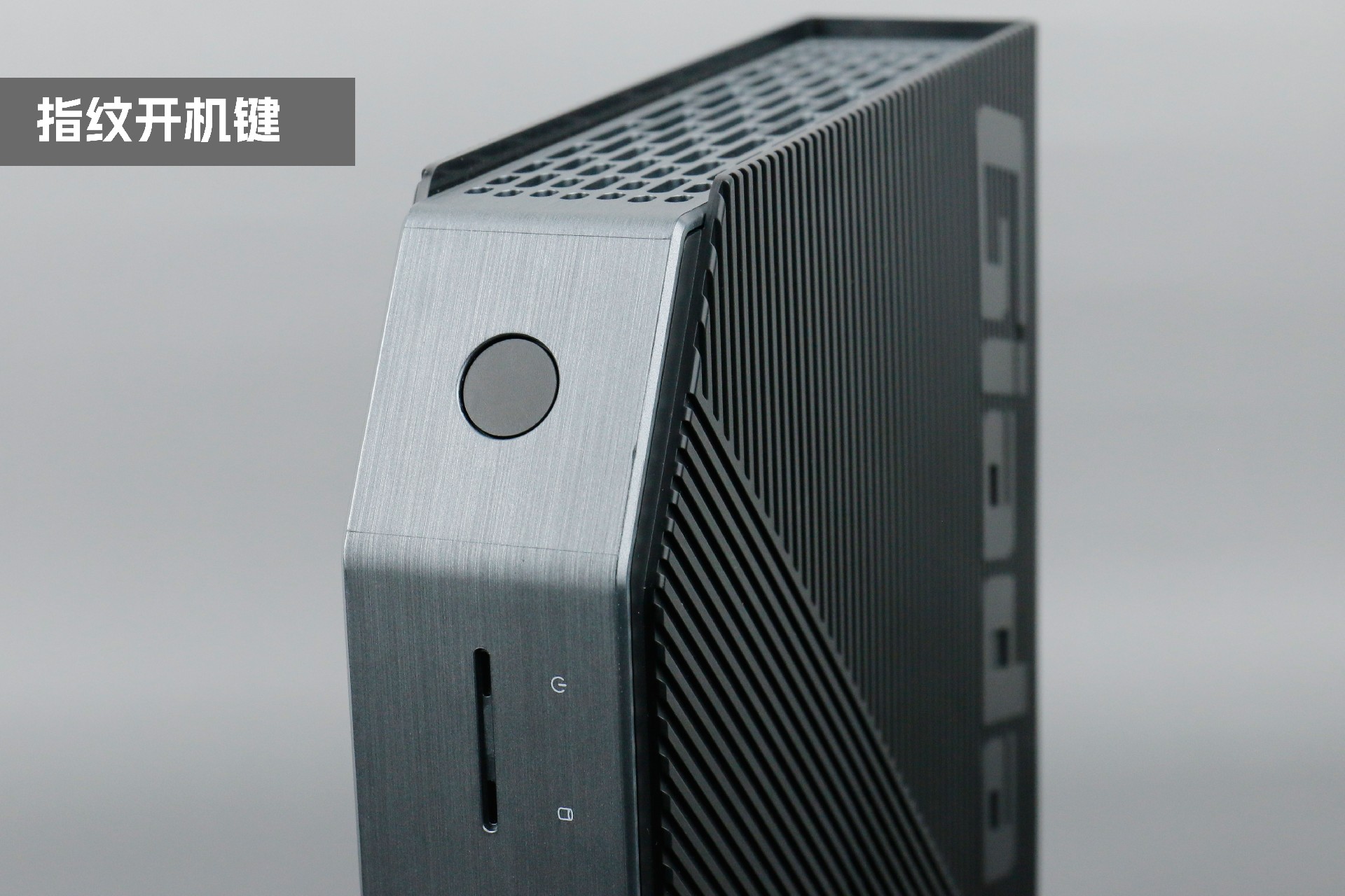 打開杰和桌面云終端Y-BOX P3,你會發(fā)現(xiàn)它的結(jié)構(gòu)并不是常見的四方體設(shè)計(jì),而是在轉(zhuǎn)角處好似被切割開一個角,切割出來的面積為指紋識別開機(jī)鍵。它的外觀為優(yōu)雅的銀灰配色,機(jī)身正面厚重感十足,頂部依然沿用黑色啞光柵格并延伸至整機(jī)背面,磨砂塑膠材質(zhì)殼,印刻杰和Giada品牌名;其他三面則為銀灰色,兩側(cè)是蜂窩式通風(fēng)口設(shè)計(jì)。