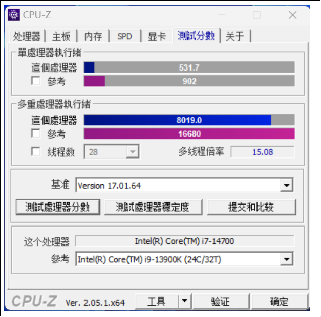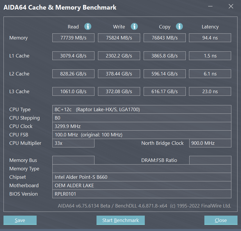 用戶關(guān)心的CPU及內(nèi)存也遙遙領(lǐng)先,CPU實(shí)測單核得分531.7左右,多核8019.0;內(nèi)存方面實(shí)測DDR5內(nèi)存讀取速度為77739MB/s,寫入速度為75824MB/s,復(fù)制速度為76843MB/s。