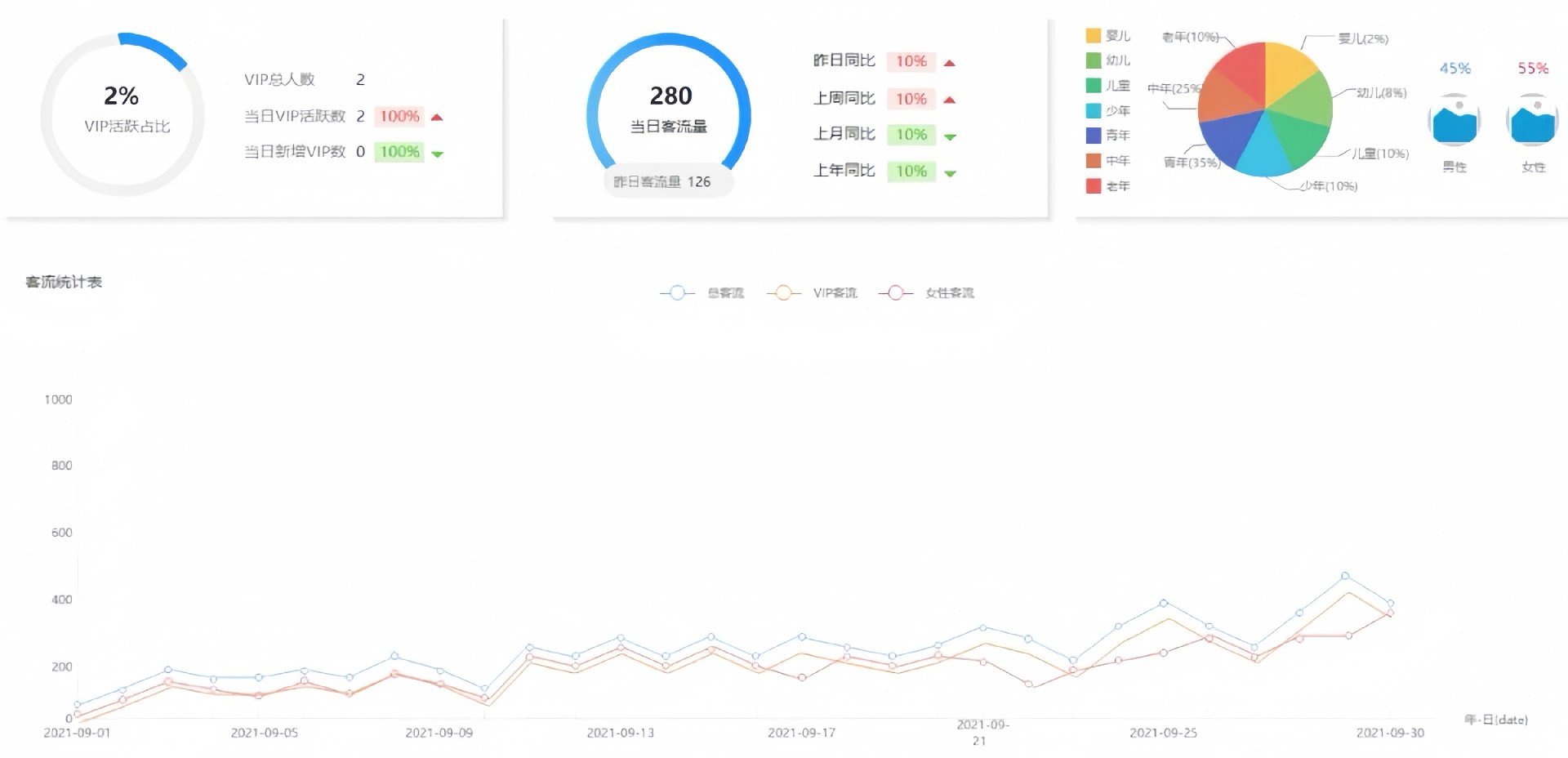 后臺(tái)還可統(tǒng)計(jì)總客流量、不同類型客流占比數(shù)、不同周期內(nèi)客流量變化比例、數(shù)據(jù)報(bào)表導(dǎo)出等,并以餅狀圖和曲線圖直觀體現(xiàn)客流量變化情況。幫助商鋪實(shí)現(xiàn)對(duì)客戶信息系統(tǒng)化管理,掌握客流變化情況,調(diào)整優(yōu)化運(yùn)營(yíng)策略的目標(biāo)