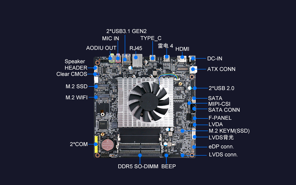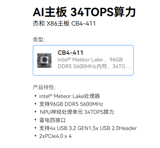 CB4-411支持英特爾Ultra5、Ultra7、Ultra9H系列處理器,支持本地AI計算,擁有34TOPS算力、DDR5高速內(nèi)存、雷電4接口、2.5 GbE 以太網(wǎng)等功能特性。還在主板功能上進(jìn)行改良,增加一鍵靜音、一鍵熄屏、一鍵音量加減的功能。