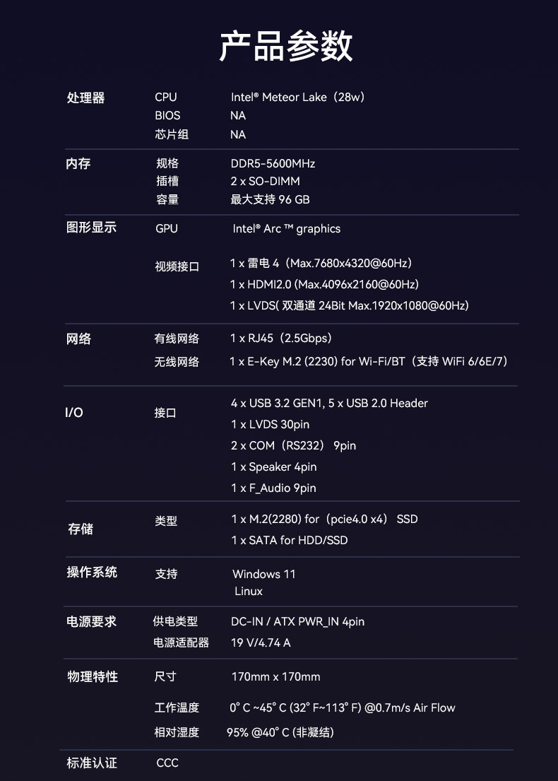 CB4-411主板采用英特爾Meteor Lake平臺,適配Ultra5、Ultra7、Ultra9H系列處理器,這些處理器以卓越的性能和能效,為各種計算任務(wù)提供了強(qiáng)大的支持。主板采用雙通道DDR5可拆內(nèi)存插槽,最大容量96GB,同時運(yùn)行多個大型程序、處理大型文件也不卡頓。