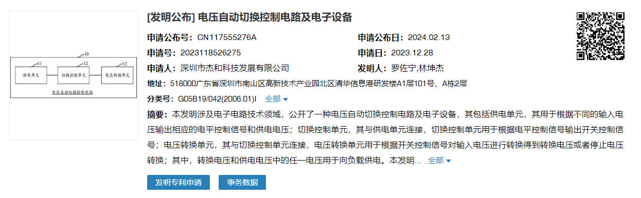 “電壓自動切換控制電路及電子設(shè)備”發(fā)明是杰和科技在電子電路技術(shù)領(lǐng)域研發(fā)的有效實踐。供電單元通過判斷電壓的大小輸出響應(yīng)的電平控制信號和與電路控制信號對應(yīng)的供電電壓,并通過電平控制信號控制切換控制單元輸出開關(guān)控制信號,以通過開關(guān)控制信號控制電壓轉(zhuǎn)換單元將輸入電壓進行轉(zhuǎn)換得到轉(zhuǎn)換電壓或控制電壓轉(zhuǎn)換單元停止工作,并通過轉(zhuǎn)換電壓和供電電壓中的任一種電壓向負(fù)載供電。