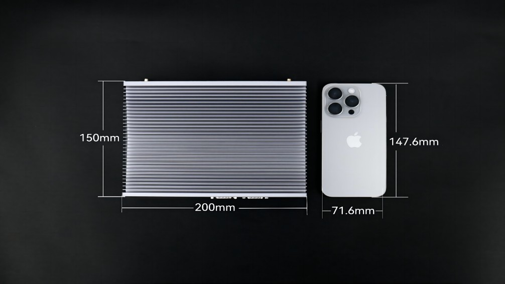 沒有了風(fēng)扇這一部件,體積也更為小巧,能輕松嵌入各類設(shè)備或狹小空間,完美貼合特定場景需求,例如:杰和AE613,其三圍尺寸是200mm x 150mm x 50mm,與iphone15的尺寸對比,寬度僅比其高度多2.4毫米,體積僅有1.5L。