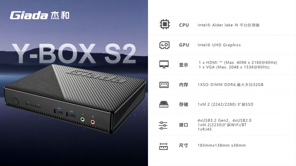 Y-BOX S2處理器平臺為Alder Lake-N,是英特爾首款采用7納米制程的產(chǎn)品系列。采用主流的DDR4內(nèi)存,支持M.2和eMMC多存儲設(shè)備可選,M.2支持PCIE X2和SATA SSD,可滿足客戶對高數(shù)據(jù)讀寫的需求,最大支持32GB;具備一個HDMI接口和一個VGA接口,可以連接到顯示器、電視及投影儀,HDMI接口支持最高分辨率為4096x2160@60Hz,VGA接口支持最高分辨率為2048x1536@60Hz。