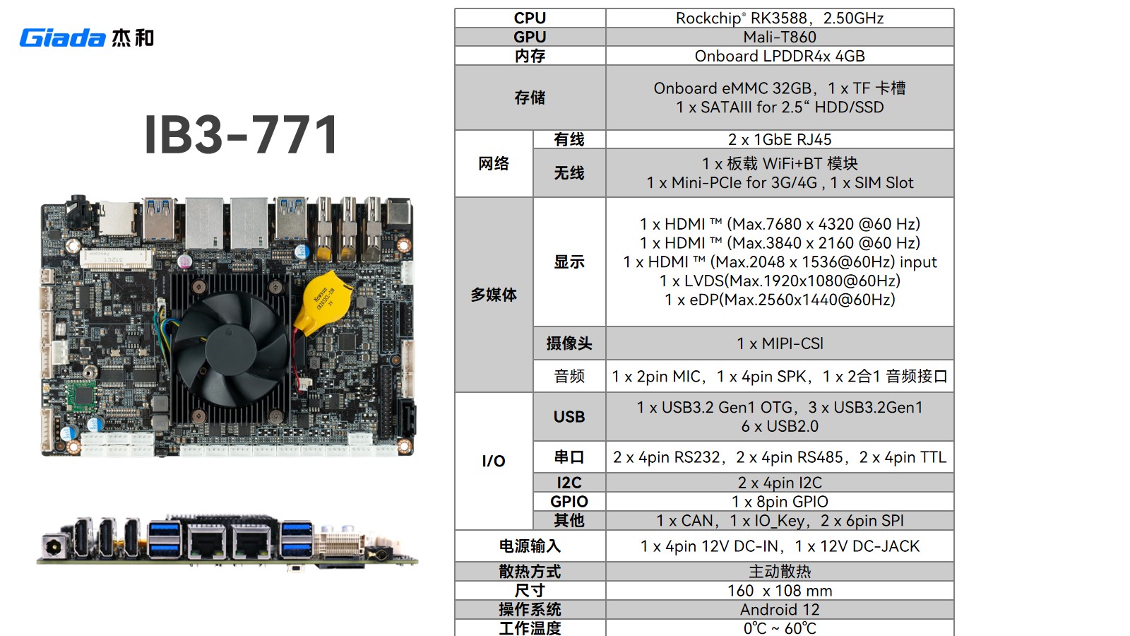 以杰和科技IB3-771、IB3-741為例,IB3-771搭載了RK3588處理器,內(nèi)置高性能NPU,6TOPS算力,8K超高清顯示輸出能力,兼容安卓12系統(tǒng),可為工業(yè)視覺檢測提供強勁算力與精細畫面支持。該主板支持多路MIPI-CSI攝像頭輸入,可與多種工業(yè)相機無縫對接,實現(xiàn)圖像采集、處理與顯示的一體化方案,快速完成物件識別篩選。