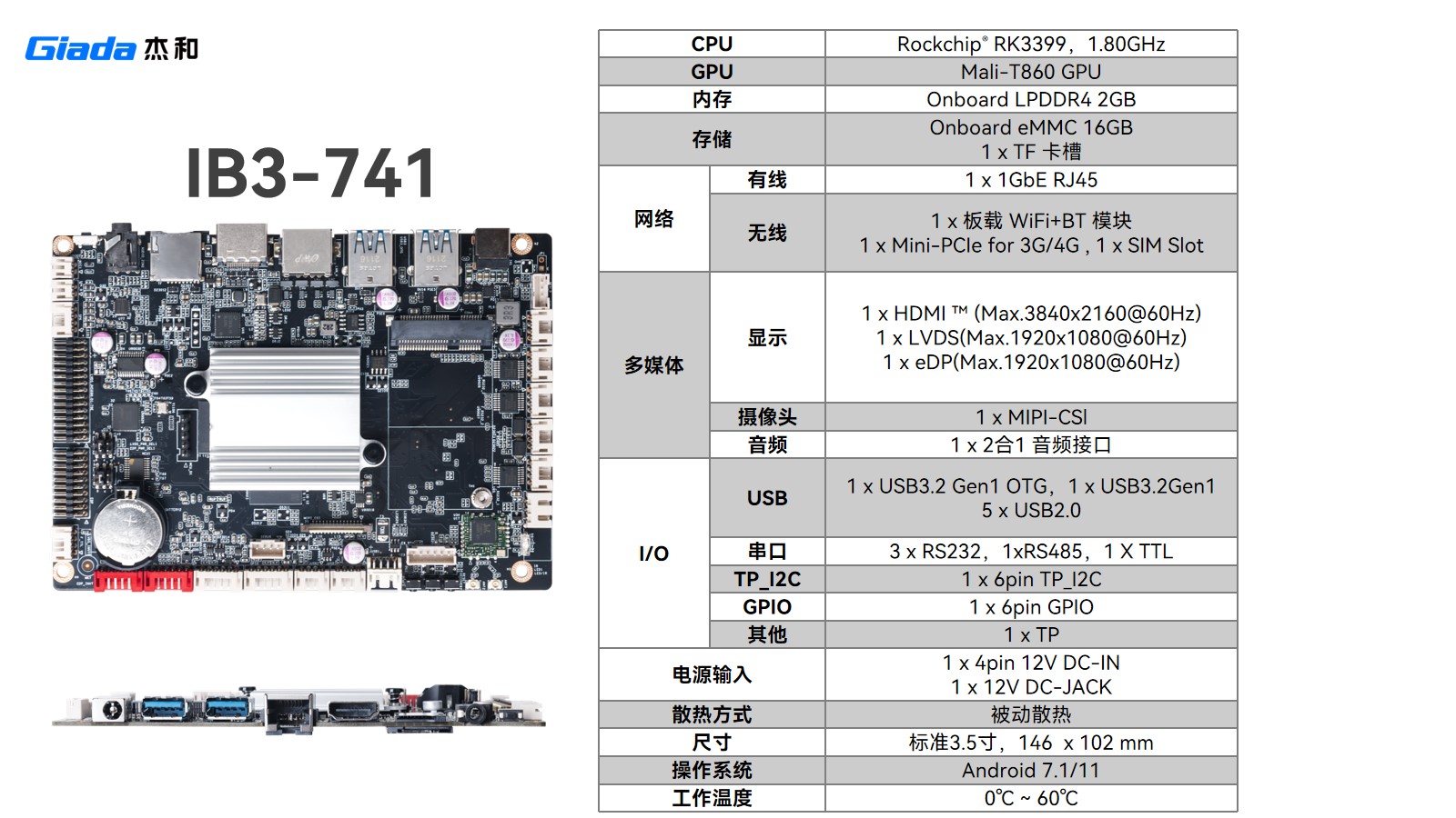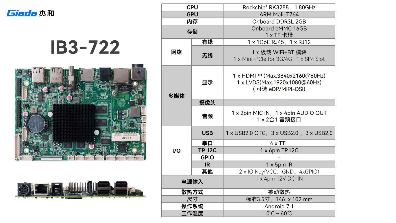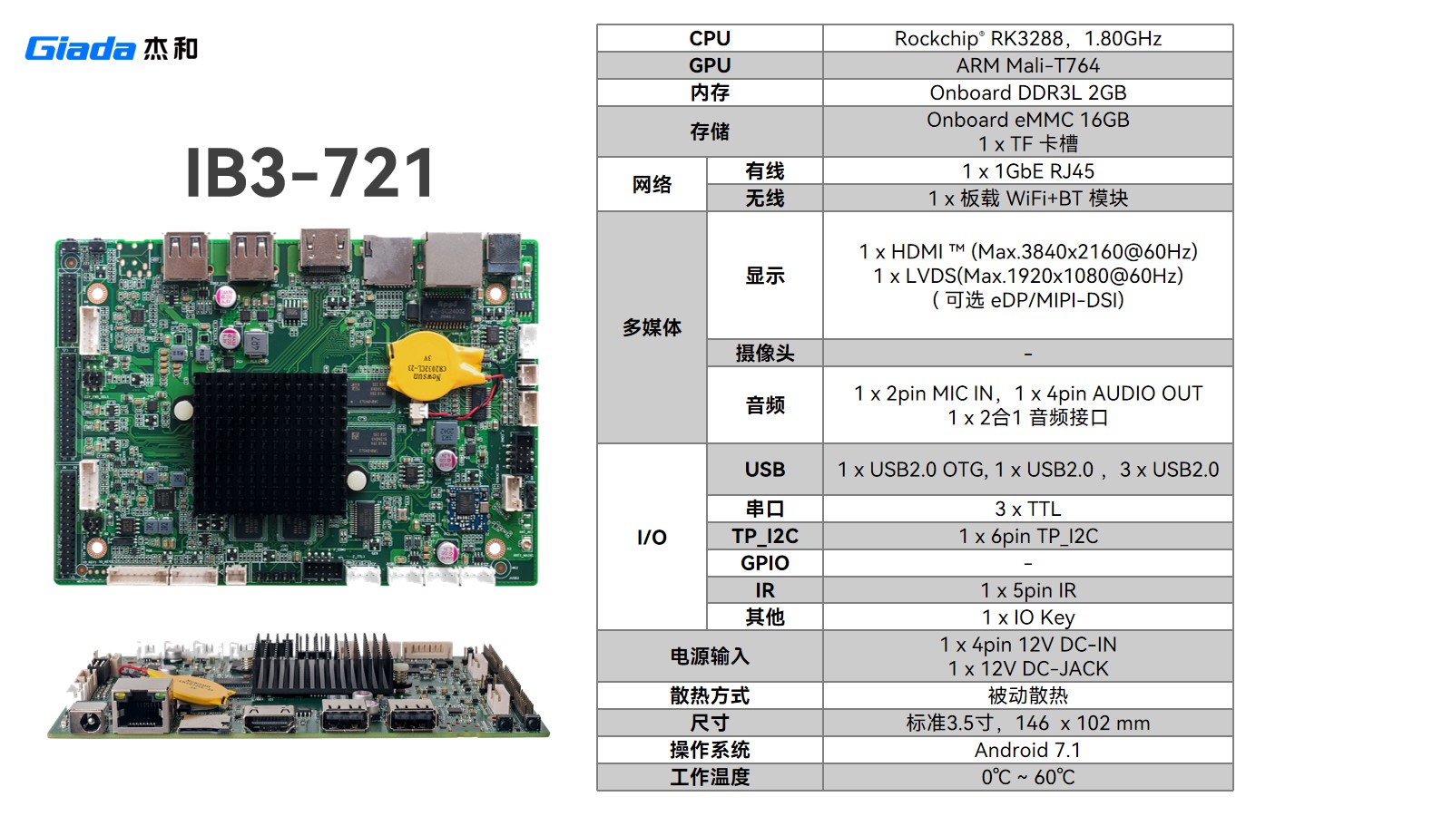IB3-721同樣采用 RK3288 處理器,通過精簡接口進一步控制成本:保留 1GbE RJ45 網(wǎng)口,刪減 RJ12 ,USB 減至 5 個、TTL 串口減為 3 個 ,在滿足基礎商顯交互(如零售機、查詢機)同時,降低成本,適配功能聚焦、對成本敏感場景 。