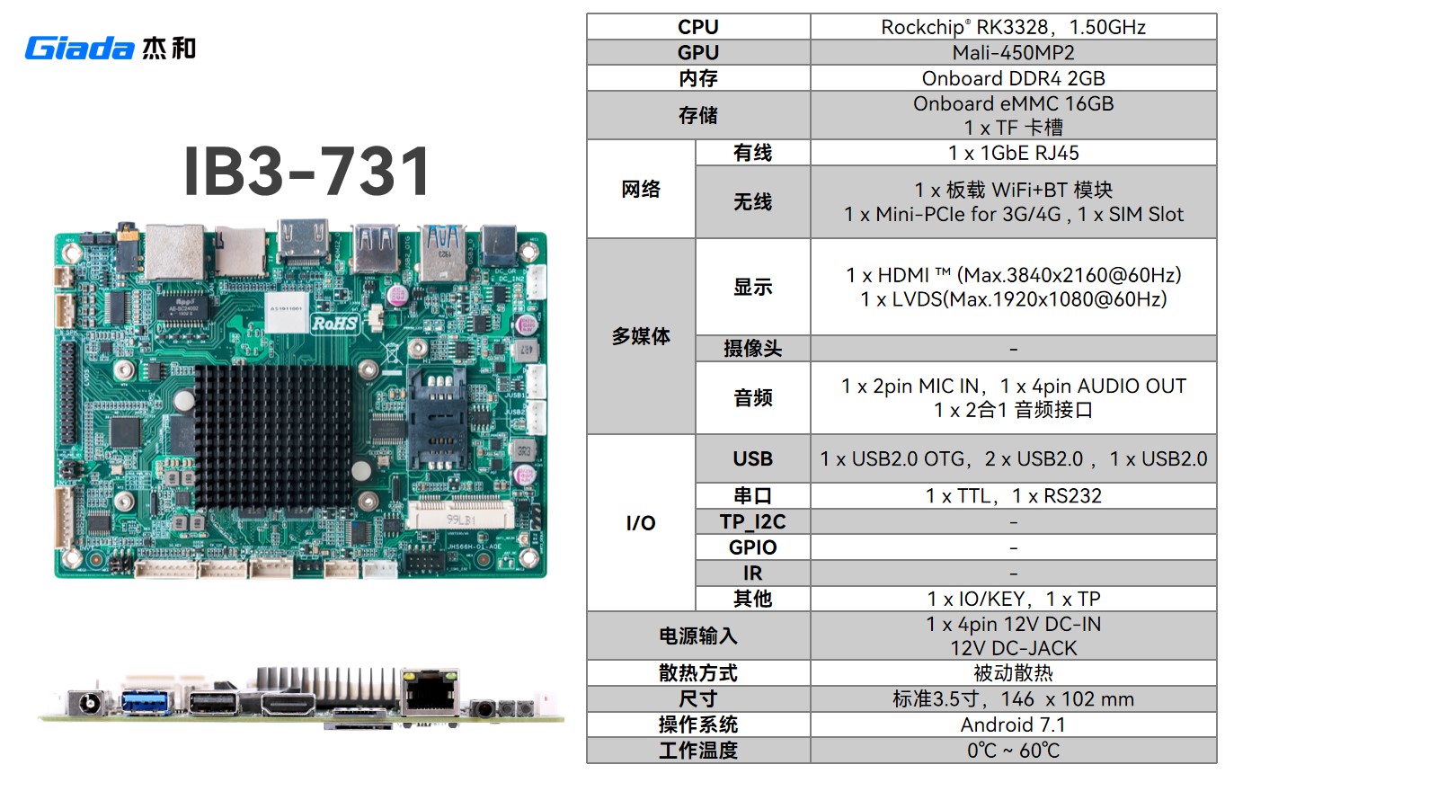 IB3-731搭載RK3328處理器,主頻1.50GHz,2GB DDR4內(nèi)存+ 16GB eMMC 存儲。1GbE RJ45、板載 WiFi + BT及Mini - PCIe擴展 3G/4G,適配多網(wǎng)絡環(huán)境;HDMI(4K@60Hz)+ LVDS(1080P@60Hz)雙顯輸出,在便利店無人零售終端,可自行實現(xiàn)基礎視頻播放、交互。是預算有限、聚焦基礎展示交互項目首選 。