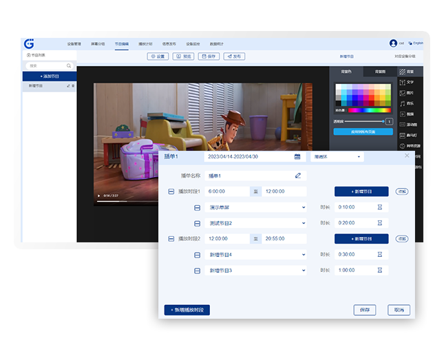 可自定義安排各類平面廣告與視頻廣告素材,可多屏拼接/多屏分離自由選擇,也可畫中畫顯示,用戶可根據(jù)場(chǎng)景自行靈活安排,更可以異形屏幕顯示安排,讓廣告顯示更加豐富多彩。