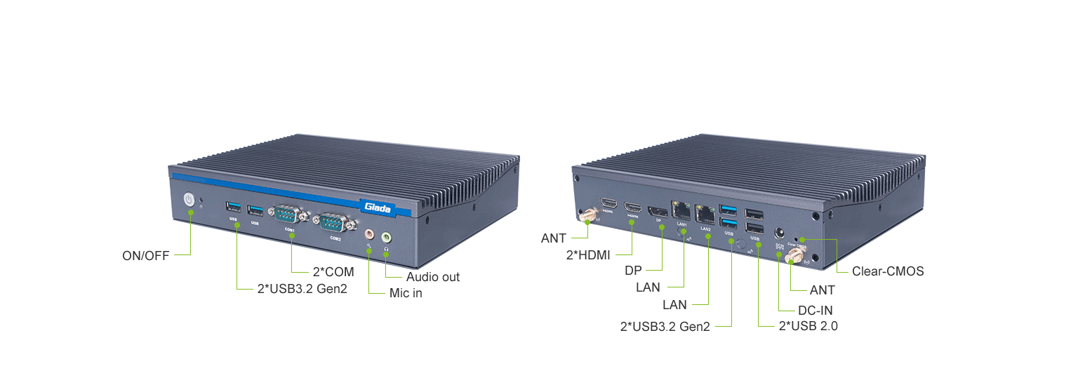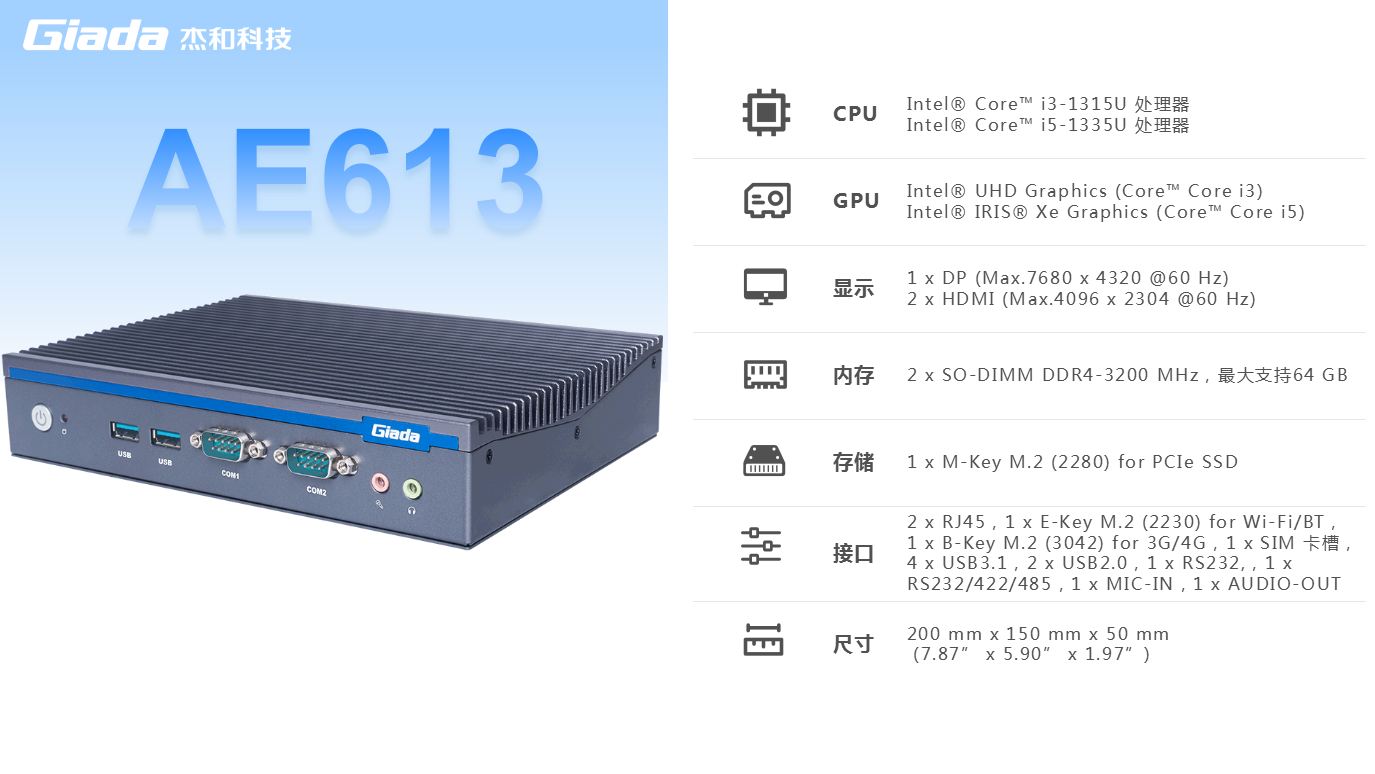 杰和科技AE613支持Windows 11 (64bit) /Linux Ubuntu (64bit)系統(tǒng),雙千兆自適應(yīng)RJ45網(wǎng)口,4 x USB3.1 (10 Gbps),2 x USB2.0,1 x RS232,,1 x RS232/422/485,1 x MIC-IN,1 x AUDIO-OUT,豐富的I/O功能接口,實(shí)現(xiàn)更多功能擴(kuò)展。