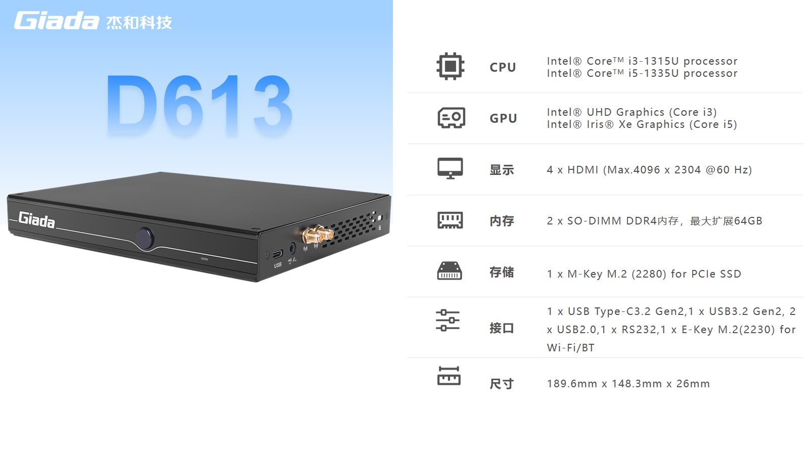 杰和數(shù)字標(biāo)牌D613搭載Intel RaptorLake Corei3-1315U/i5-1335U處理器,可以同時(shí)連接4個(gè)4K顯示器,支持4K分辨率編碼解碼,還支持5G蜂窩網(wǎng)絡(luò),速度比4G LTE快10倍。