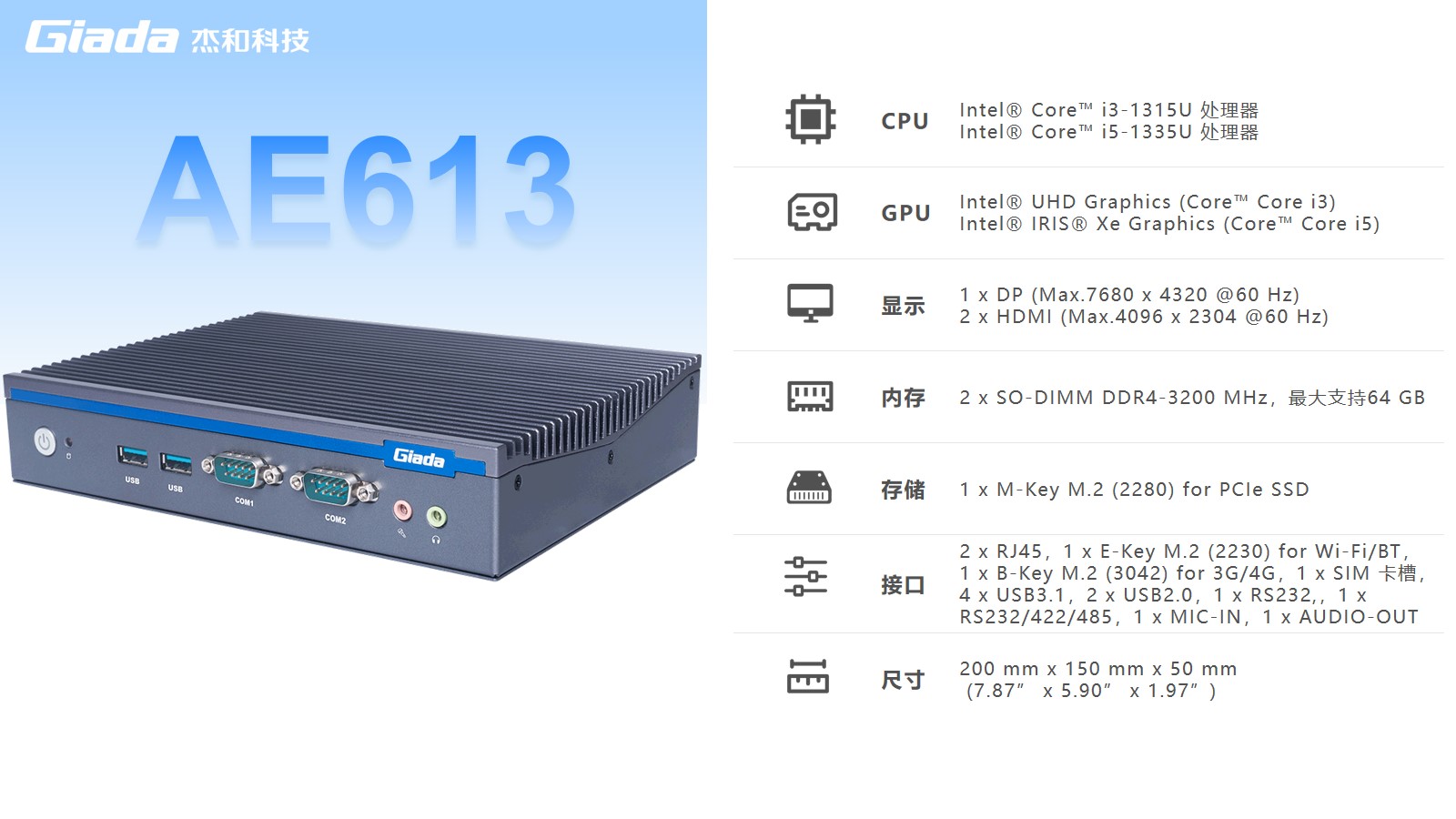 杰和AE613搭載英特爾Raptor Lake酷睿i3-1315U/i5-1335U 處理器,開(kāi)創(chuàng)了性能和效率的新紀(jì)元,TDP為15W,可最大程度降低能耗,延長(zhǎng)電池壽命。
