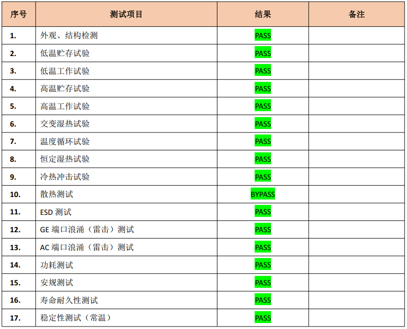 通過七項測試,實驗前后外觀無異常變形,無噪音增加,在 BIOS、OS 下硬盤、DIMM 沒有掉失,且槽位號正確,電源、硬盤、網(wǎng)卡等指示燈顯示正常,壓力軟件運行正常,沒有出現(xiàn)性能異常現(xiàn)象,所有接口功能正常,測試通過。