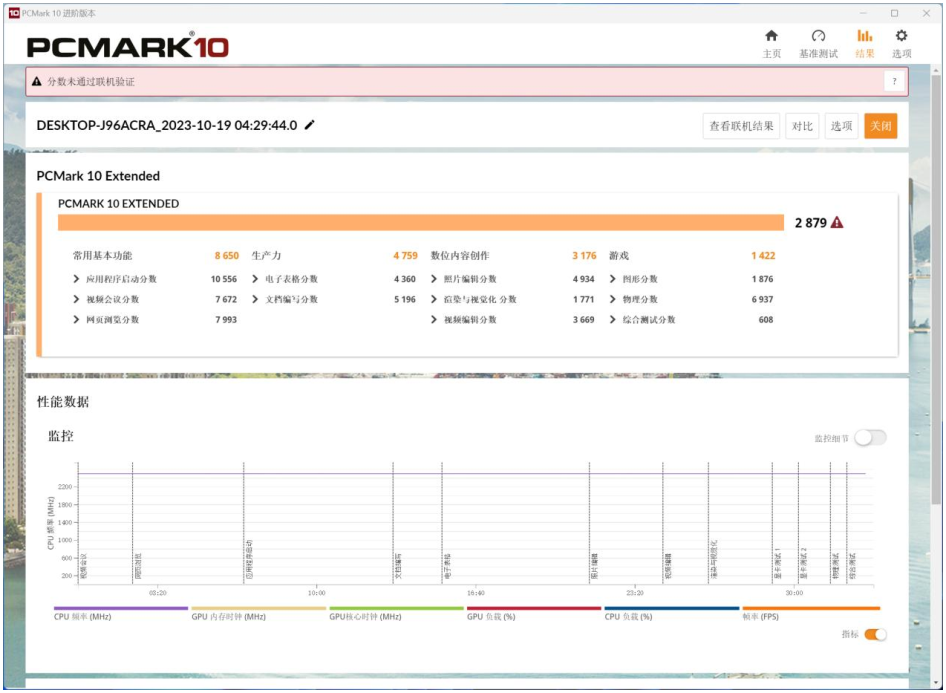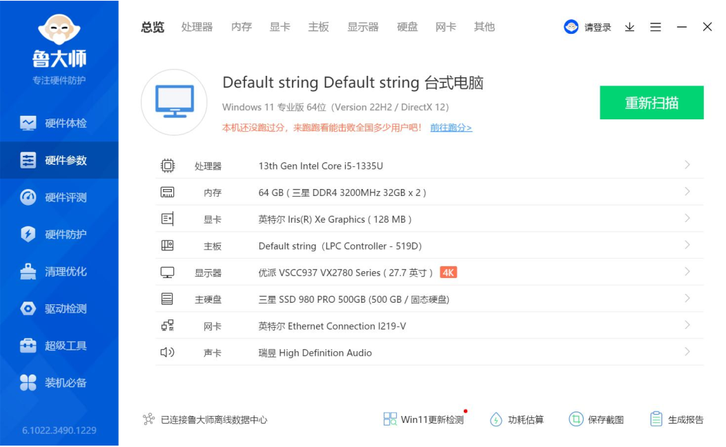 上面是魯大師識別的杰和AE613硬件參數(shù)詳情,我們進行跑分測試的核心三大件選擇的是13th Gen Intel(R) Core(TM) i5-1335U @1.30GHz處理器,Intel(R) Iris(R) Xe Graphics顯卡,三星 32GB*2 DDR4 3200MHz內(nèi)存,三星SSD 980 PRO 500GB(500 GB/固志硬盤),下面我們來看詳細的跑分數(shù)據(jù)。