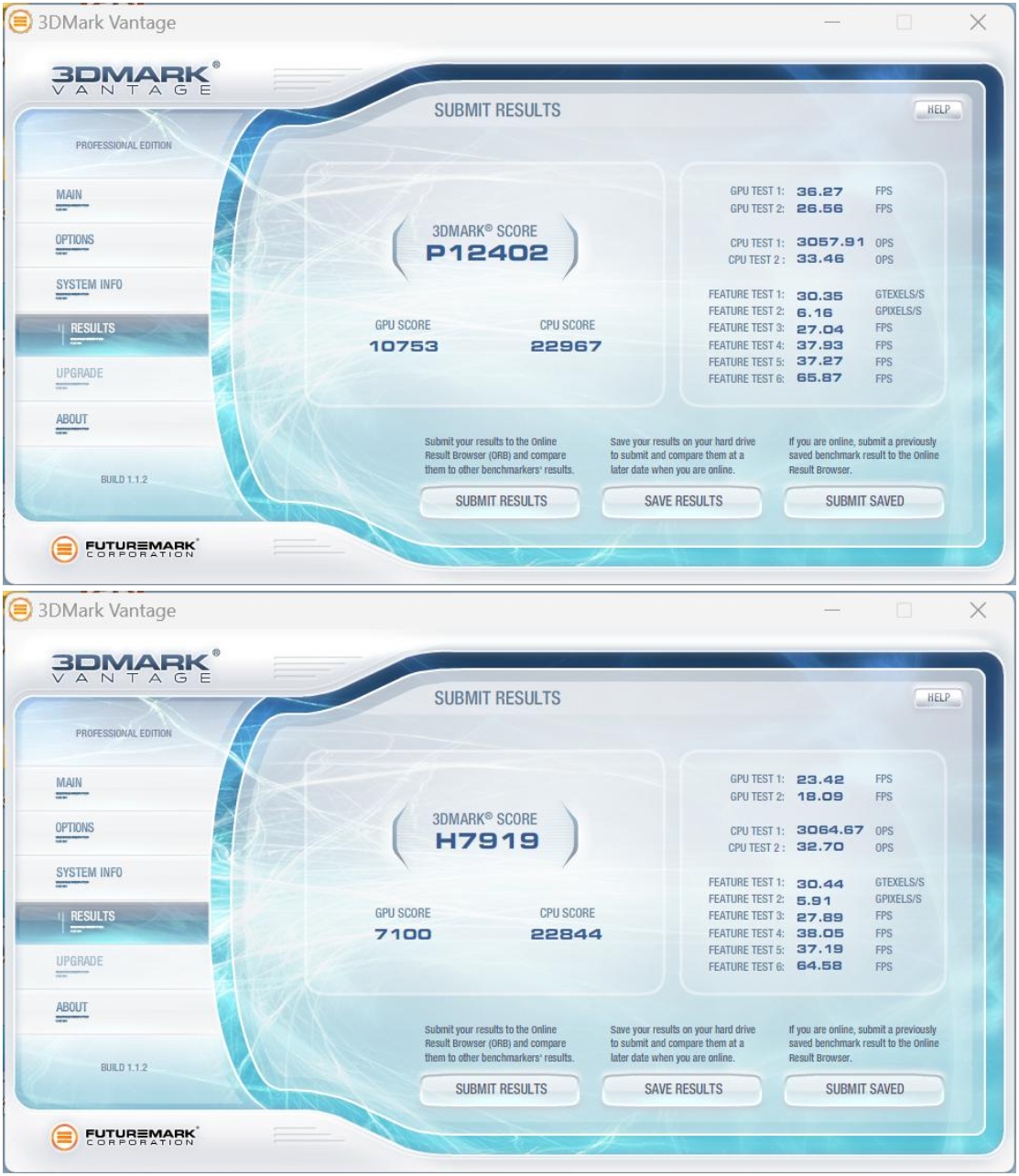 3DMark Vantage一款3D圖形性能評測軟件,主要用于評測電腦的顯卡和處理器的性能。我們按照畫質(zhì)等級,記錄了性能級(Performance,P)和高端級(High,H)兩份數(shù)據(jù)。其中,Performance的綜合得分為P12402,High的綜合得分為H7919,表現(xiàn)不錯,這個成績已經(jīng)完全能夠滿足主流用戶的需求了。