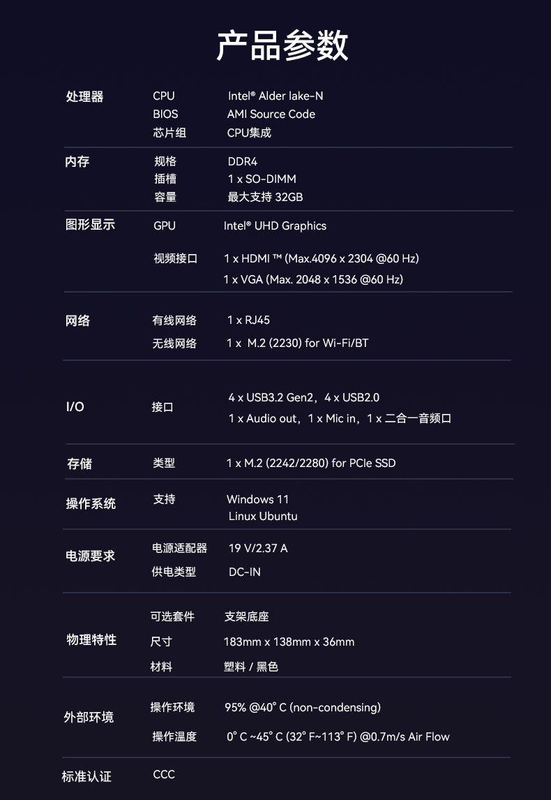 1、支持intel最新平臺(tái) Alder Lake-N平臺(tái)處理器,為英特爾首款基于 7nm 的產(chǎn)品線,最高可支持到8核;