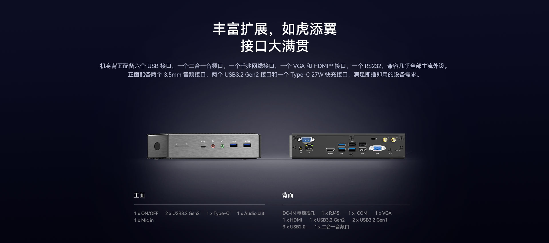 | I/O | 接口 | 3 x USB3.2 Gen2 ,2 x USB3.2 Gen1, 3 x USB2.0,1 x Type-C 1 x RS232 |
