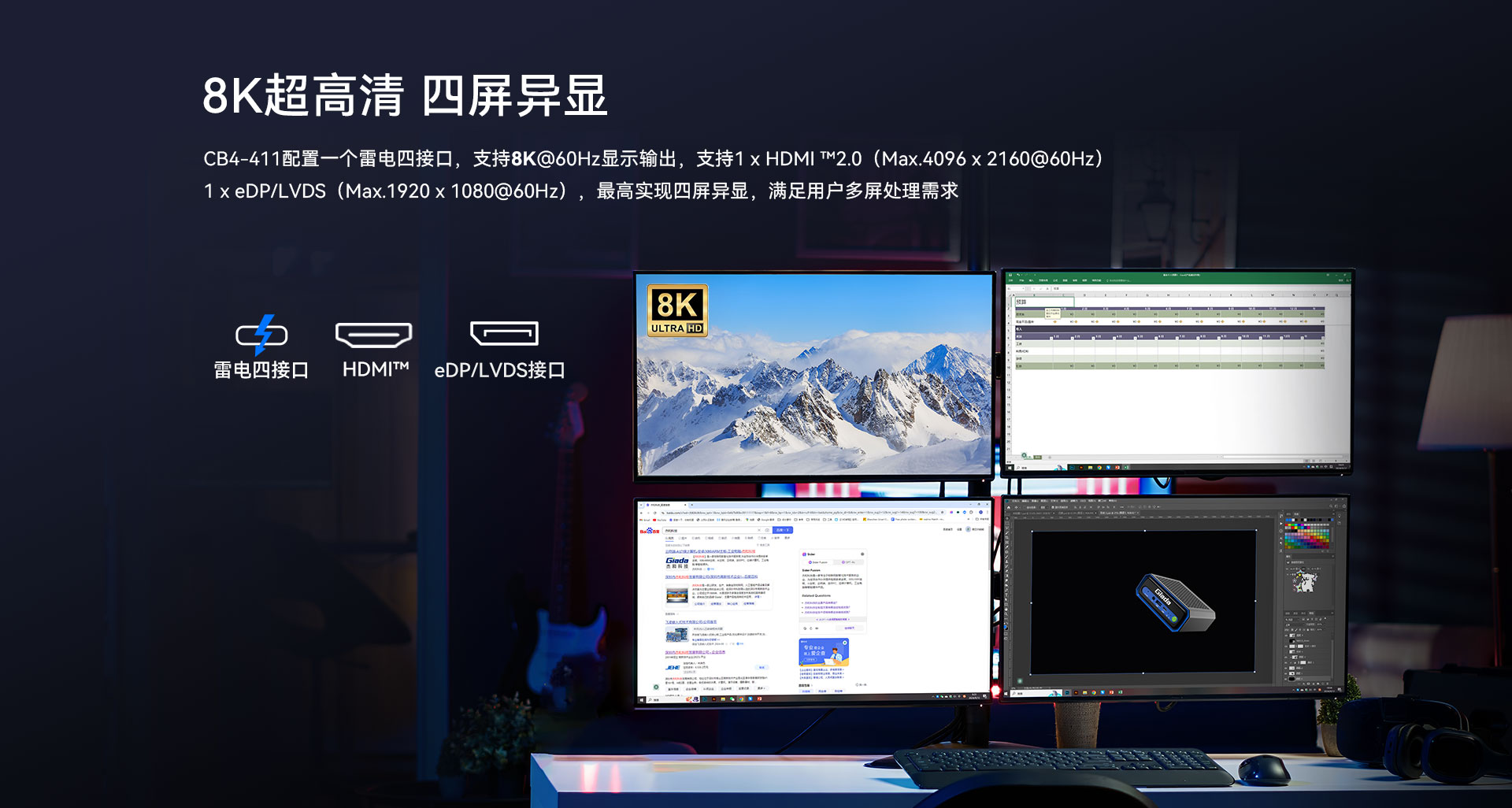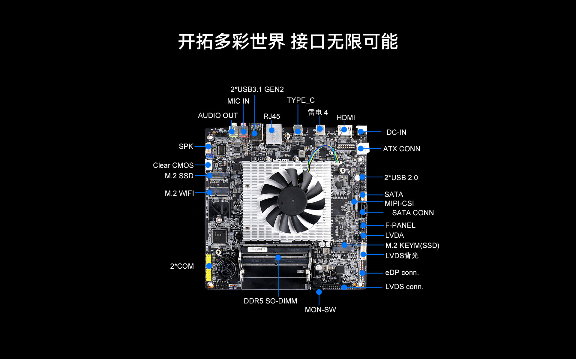 | 外部I/O | 接口 | 2 xUSB3.2Gen2(5G) 1 x雷電4 (Max 7680 x4320 @60 Hz) 1 xHDMI?2.04 (Max.4096 x2160@60 Hz) 1 xLVDS(雙通道 24BIT Max1920*1080@Hz) 1 x MIC-IN, 1 x AUDIO-OUT | |