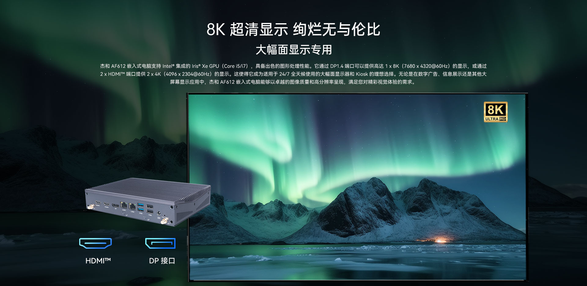 | 視頻接口 | 2 x HDMI (Max. 4096 x 2160@60Hz) 1 x DP (Max.7680 x 4320 @60 Hz) JAE端:1 x HDMI (Max. 4096 x 2160@60Hz) | |