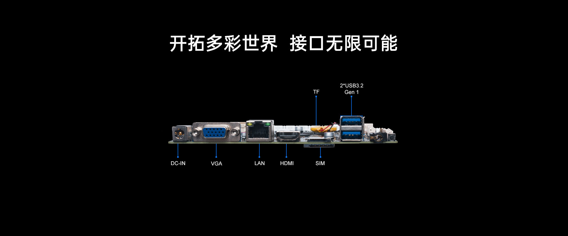 | 外部I/O | 接口 | 1 x HDMITM(Max.3840x2160@60Hz) 1 x VGA(Max.1920x1080@60Hz) 1 x USB3.2Gen1,1 x USB3.2Gen1 OTG 1 x RJ45 1 x 全高Mini-PCIe擴展3G/4G 1 xSIM卡槽,板載WIFI/BT 1 x 2-IN-1 Headset (AUDIO-OUT & MIC-IN) |