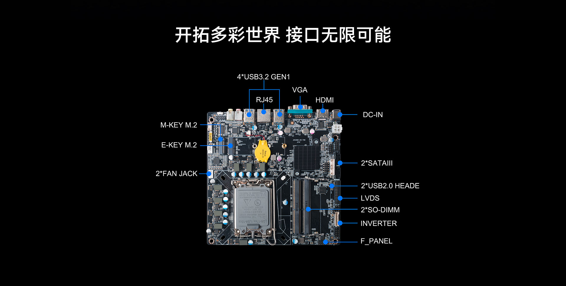 | 外部I/O | 接口 | 1 x HDMITM(Max.4096 x 2160 @60 Hz) 1 x VGA (Max.2048 x 1536 @60 Hz) 1 x LVDS (Max.1980 x 1080 @60 Hz) 4 x USB 3.0 4 x USB 2.0 Header 1 x RJ45 1 x MIC-IN, 1 x AUDIO-OUT |