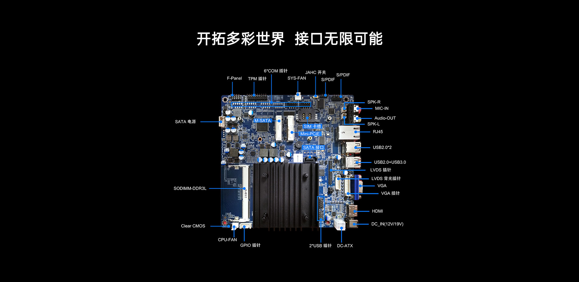 | 內(nèi)部I/O | 接口 | 1x30pinLVDS(Max.1920x1080@60Hz) 2xUSB2.0插針(4個USB2.0) 1xMini-PCle擴(kuò)展WiFi/BT/3G/4G 1xMini-PCle;擴(kuò)展;mSATA 6x10pinCOM,1xSIM卡槽,1x4pinATX,1xSATA 1x4pinSPK,1x10pinF_AUDIO,1xGPIO |