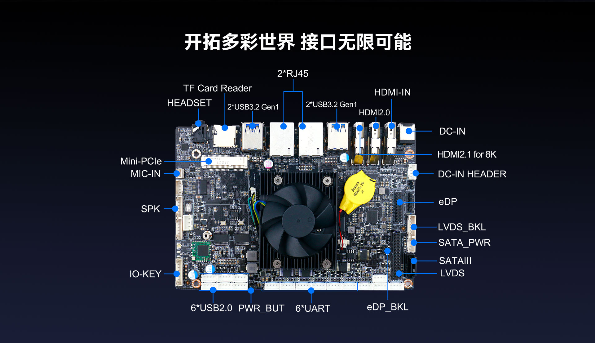 | 外部I/O | 接口 | 1 x HDMI ? (Max.7680 x 4320 @60 Hz) 1 x USB3.2 Gen1 OTG,3 x USB3.2 Gen1 2 x RJ45 1 x TF卡槽 1 x 2-IN-1 Headset (AUDIO-OUT & MIC-IN) 1 x Power on, 1 x Recovery |