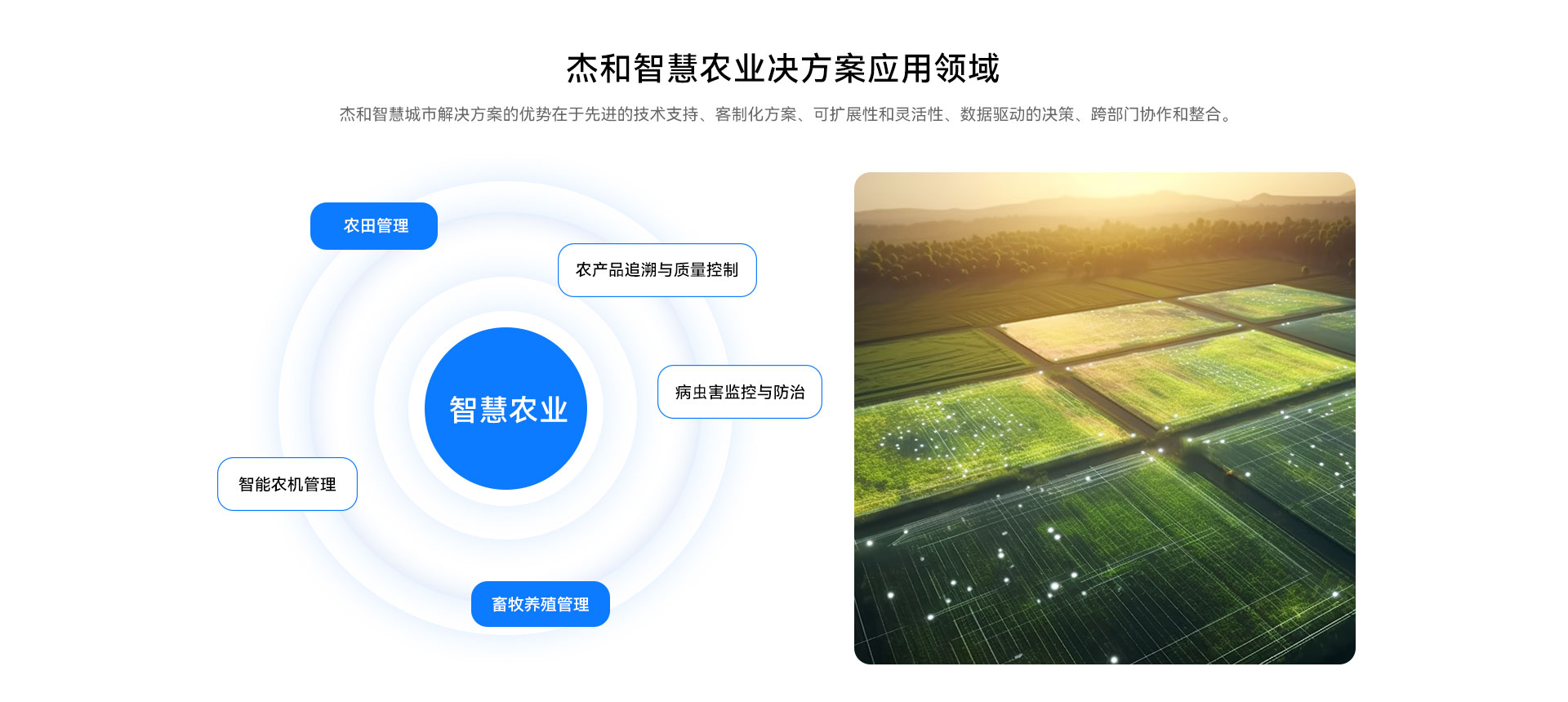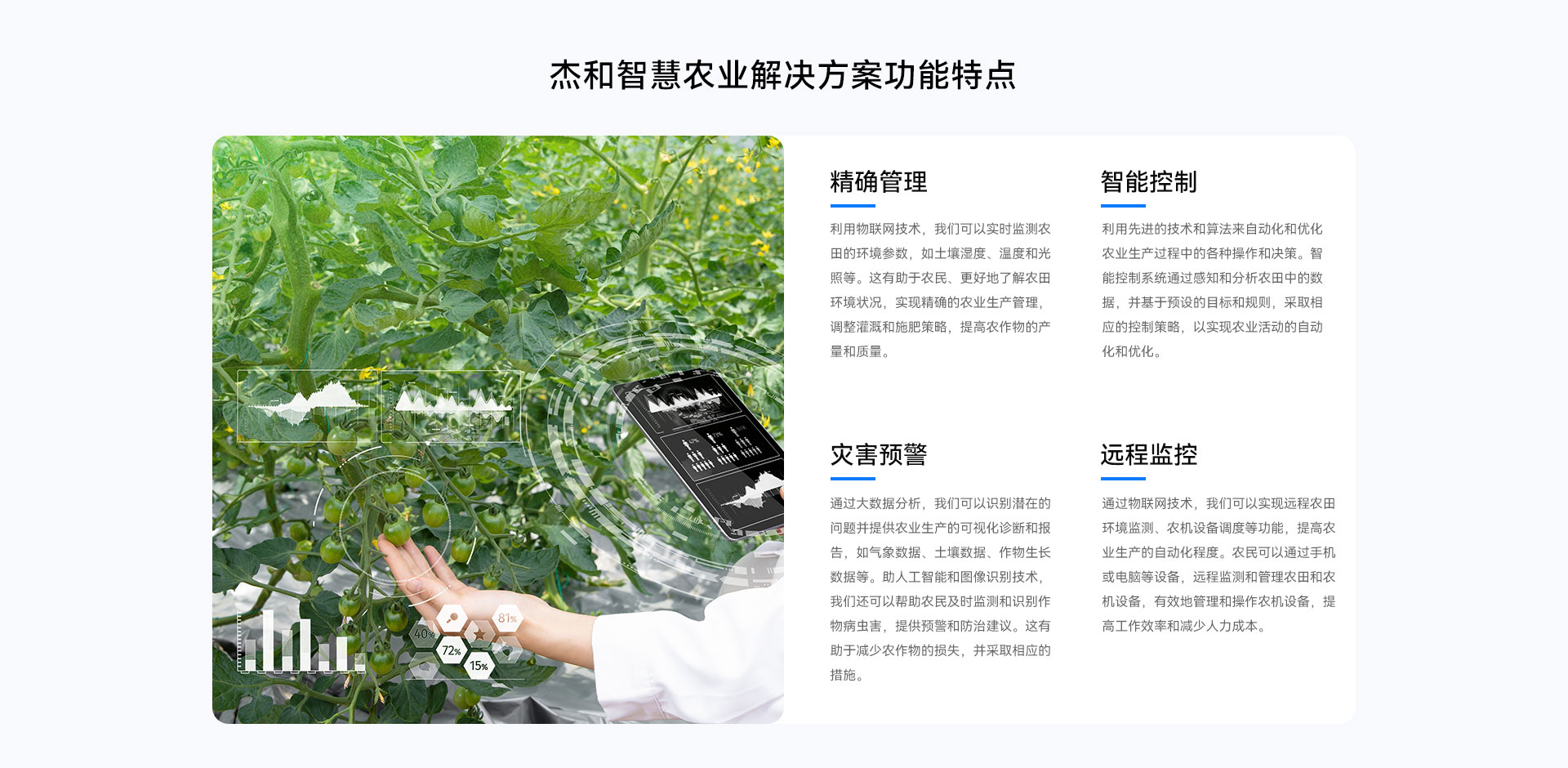 杰和智慧農(nóng)業(yè)解決方案是一套基于物聯(lián)網(wǎng)、云計(jì)算、大數(shù)據(jù)等技術(shù)的綜合性